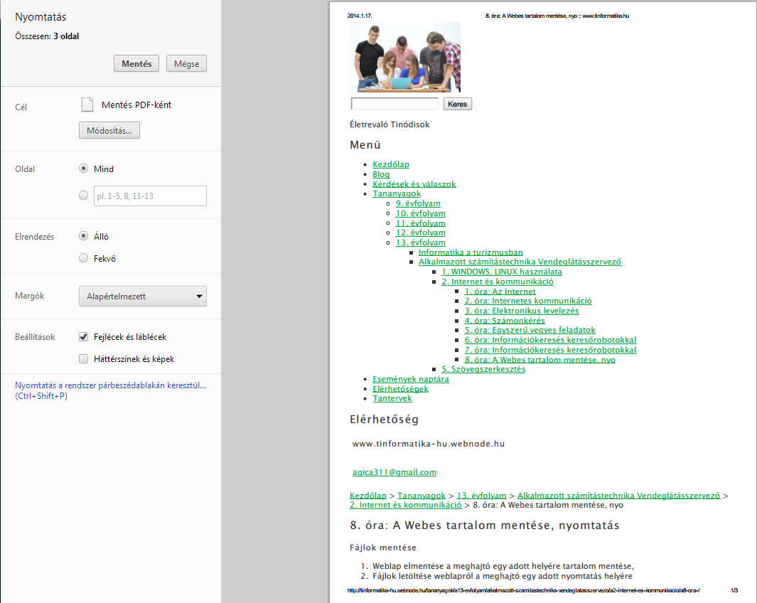 - Ments el az oldalt álló formátumban a "A Webes tartalom mentése" mappába, a fálj neve "álló nyomtatás" legyen!