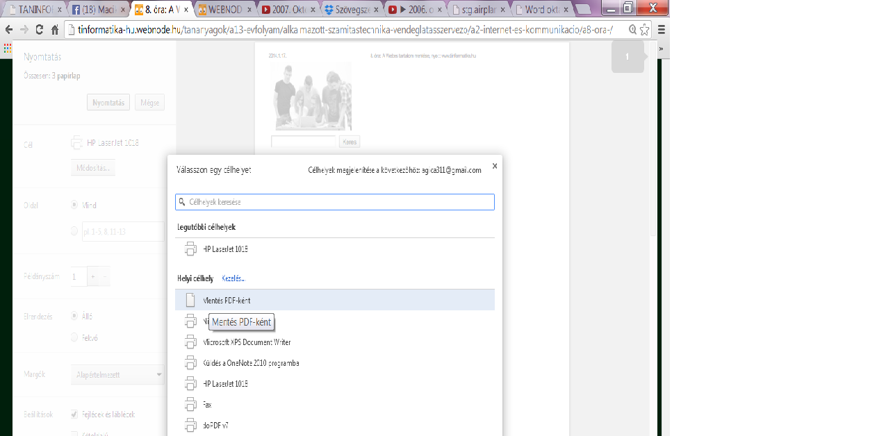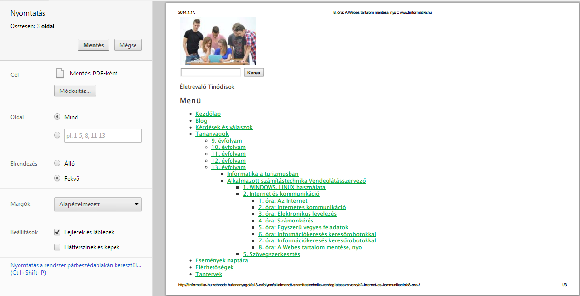 - Ments el az oldalt fekvőformátumban a "A Webes tartalom mentése" mappába, a fálj neve "fekvő nyomtatás" legyen!